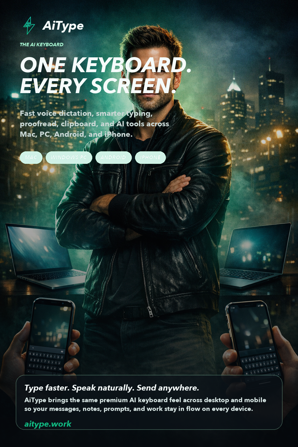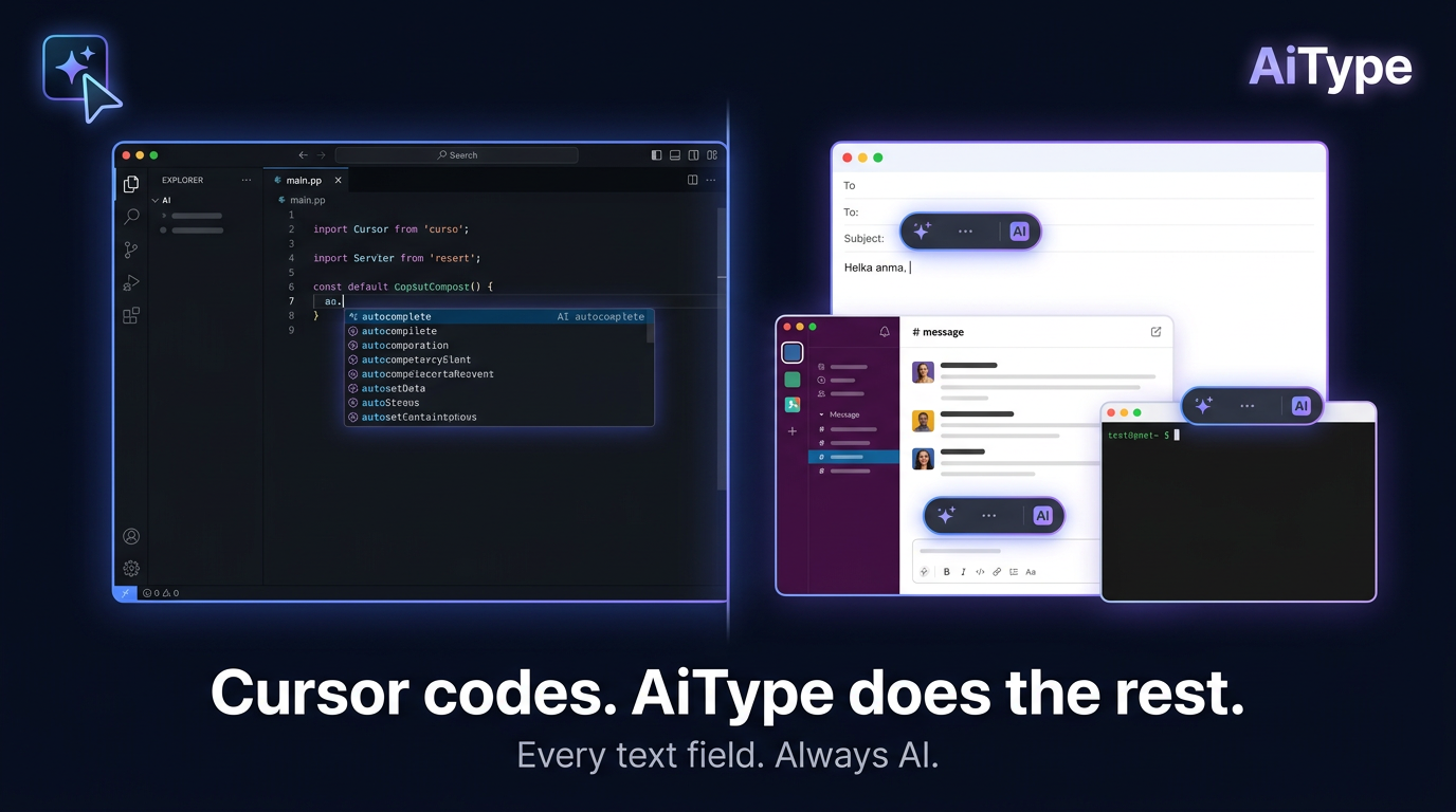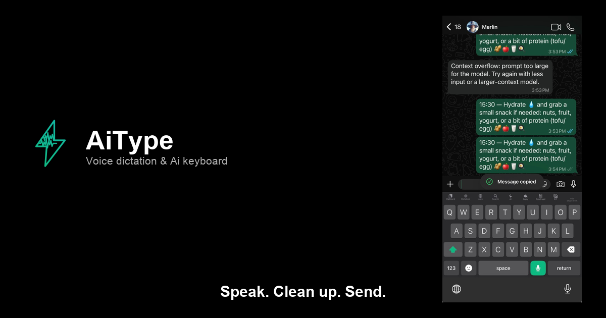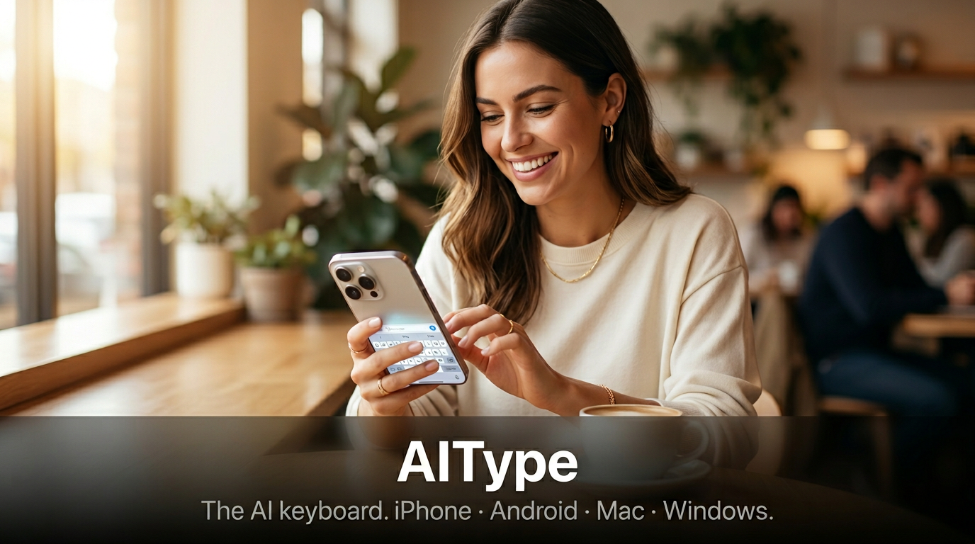 AiType is a voice dictation tool that turns speech into clean, polished text in ~250ms — on Mac, Windows, iPhone, and Android. It's the first dictation tool to include an AI cleanup pass that removes filler words, fixes punctuation, and rewrites awkward phrasing automatically before you paste.